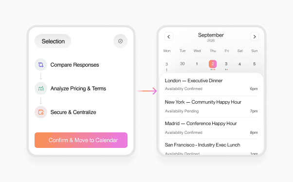 Compare responses and confirm bookings quickly, accelerating your entire event planning process from start to finish.