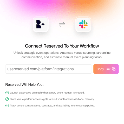 Add the Reserved app to your Slack workspace to bring event planning directly into your team’s daily workspace. This allows your team to manage venue sourcing and coordination without leaving Slack.